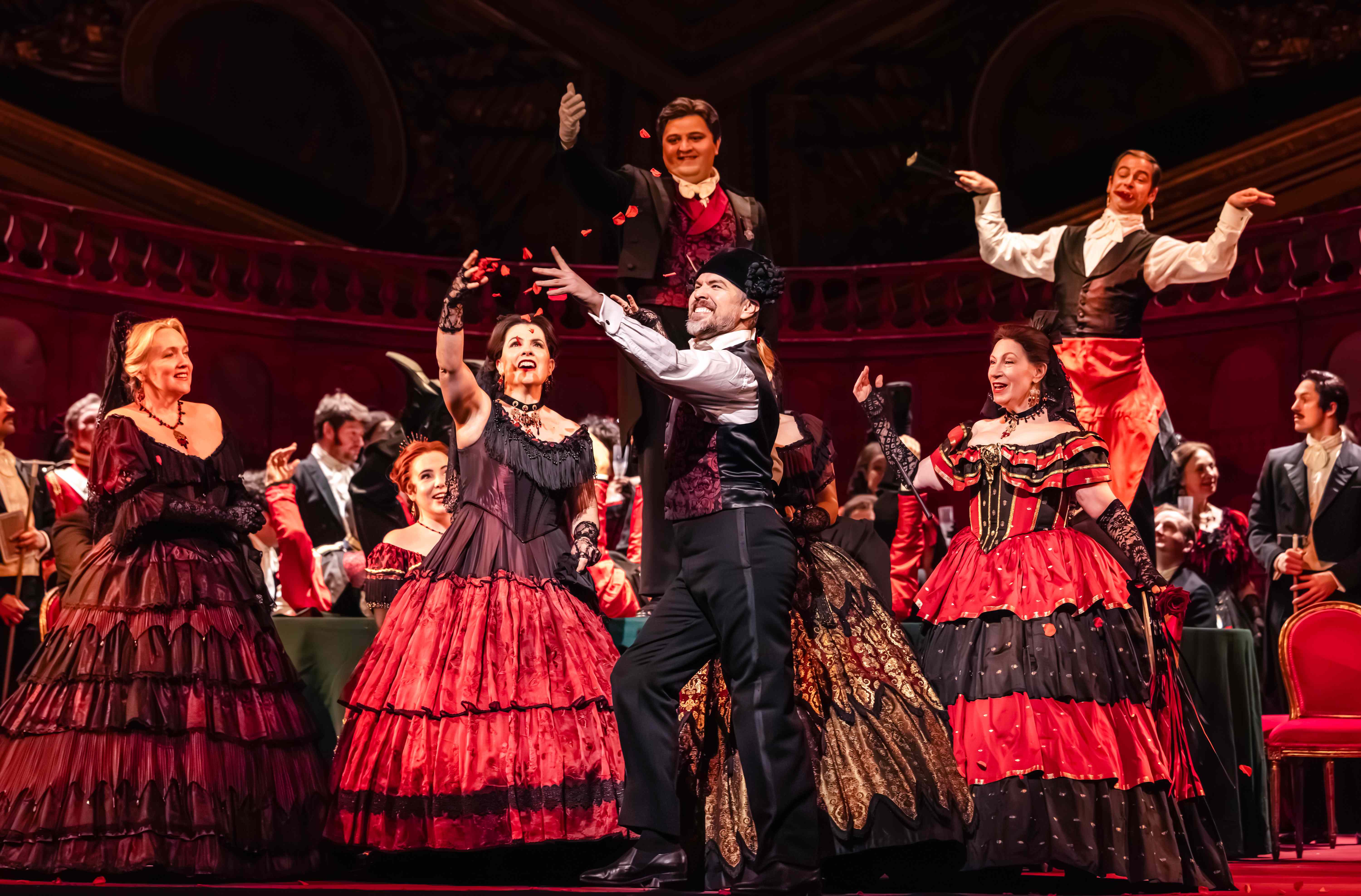 そのヤオが今回、かつての自らを凌ぐ圧倒的なヴィオレッタを披露し、長年のオペラ・ファンから若い観客までを熱狂させた。成熟した声の魅力に加え、演技とは思えぬほど、真に迫るパフォーマンスがヴィオレッタ像をくっきりと浮かび上がらせる。彼女を愛する青年アルフレードを演じるのは、今回が英国ロイヤルデビューとなるイタリア人テナー、ジョヴァンニ・サラ。巨匠リッカルド・ムーティの薫陶を受けてきた逸材であり、熱情あふれる歌唱と演技はアルフレード役にふさわしい。父ジェルモンを歌うのは、豊かな声を誇るアレクセイ・イサエフ。指揮は、ロンドンの批評でも絶賛されたアントネッロ・マナコルダ。ロイヤル・オペラ・ハウス管弦楽団は彼の縦糸と横糸を織りなすような音楽づくりに応え、華やかな宴からヴィオレッタの死までを描き切った。合唱もまた、本作に描かれる19世紀半ばのパリの享楽的な男女を生き生きと体現し、舞台に躍動を与えている。